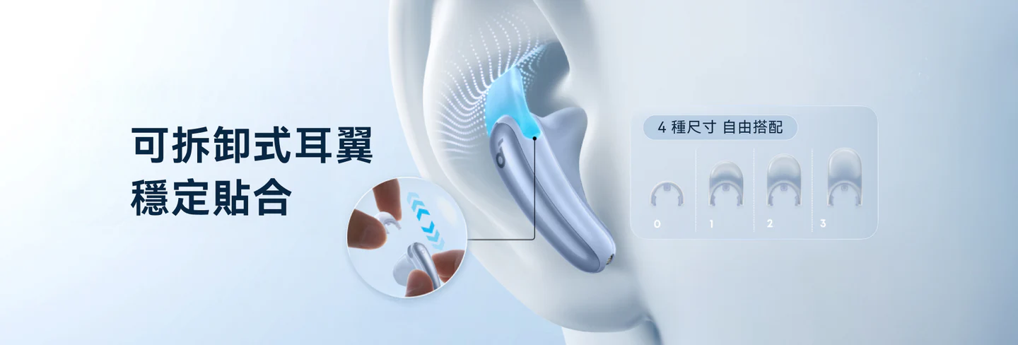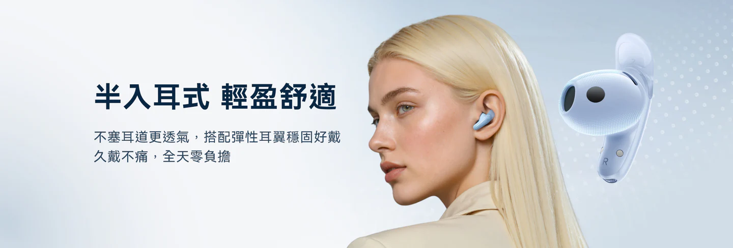 不塞耳道更透氣,搭配彈性耳翼久戴不痛又穩固,全天零負擔